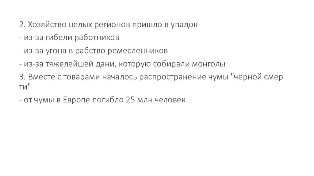 2. Хозяйство целых регионов пришло в упадок - из - за гибели работников - из - за угона в рабство ремесленников - из - за тяжелейшей дани, которую собирали монголы 3. Вместе с товарами началось распространение чумы " чёрной смерти " - от чумы в Европе погибло 25 млн человек