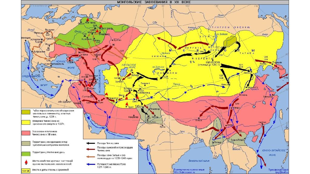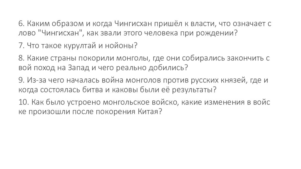 6. Каким образом и когда Чингисхан пришёл к власти, что означает слово " Чингисхан ", как звали этого человека при рождении ? 7. Что такое курултай и нойоны ? 8. Какие страны покорили монголы, где они собирались закончить свой поход на Запад и чего реально добились ? 9. Из - за чего началась война монголов против русских князей, где и когда состоялась битва и каковы были её результаты ? 10. Как было устроено монгольское войско, какие изменения в войске произошли после покорения Китая ?