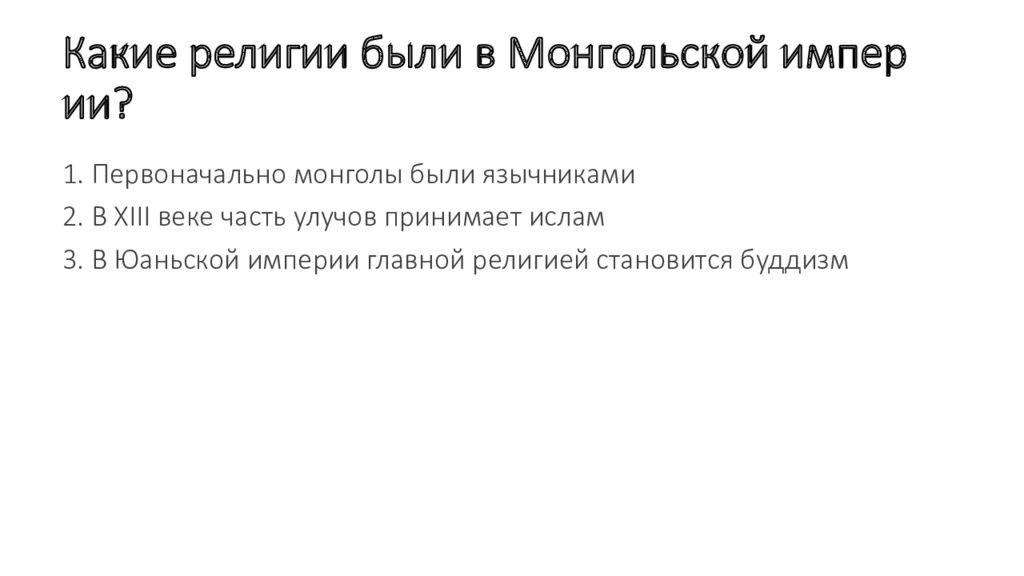 1. Первоначально монголы были язычниками 2. В XIII веке часть улучов принимает ислам 3. В Юаньской империи главной религией становится буддизм