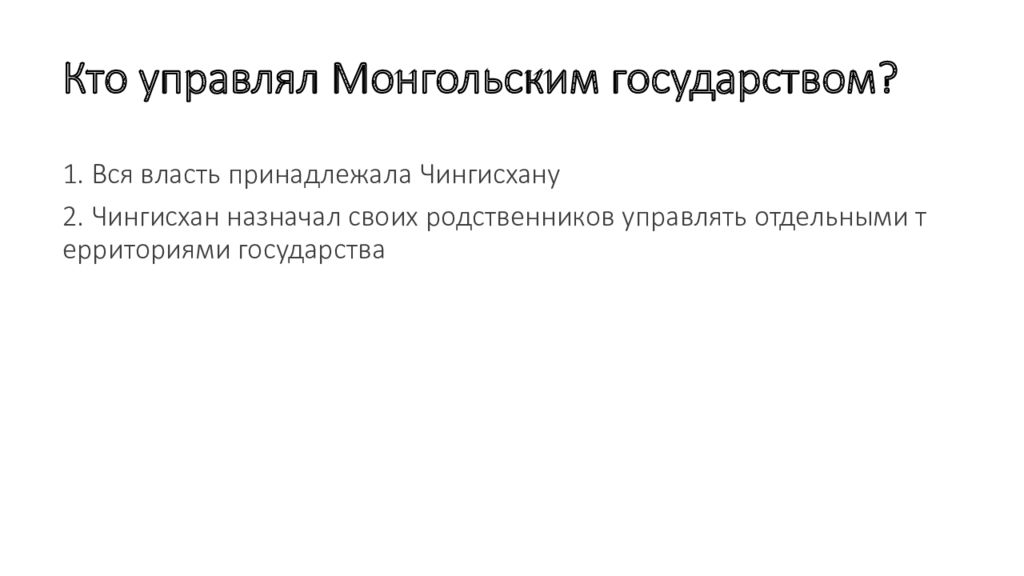 1. Вся власть принадлежала Чингисхану 2. Чингисхан назначал своих родственников управлять отдельными территориями государства
