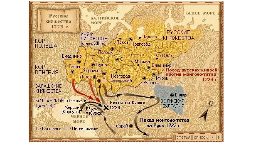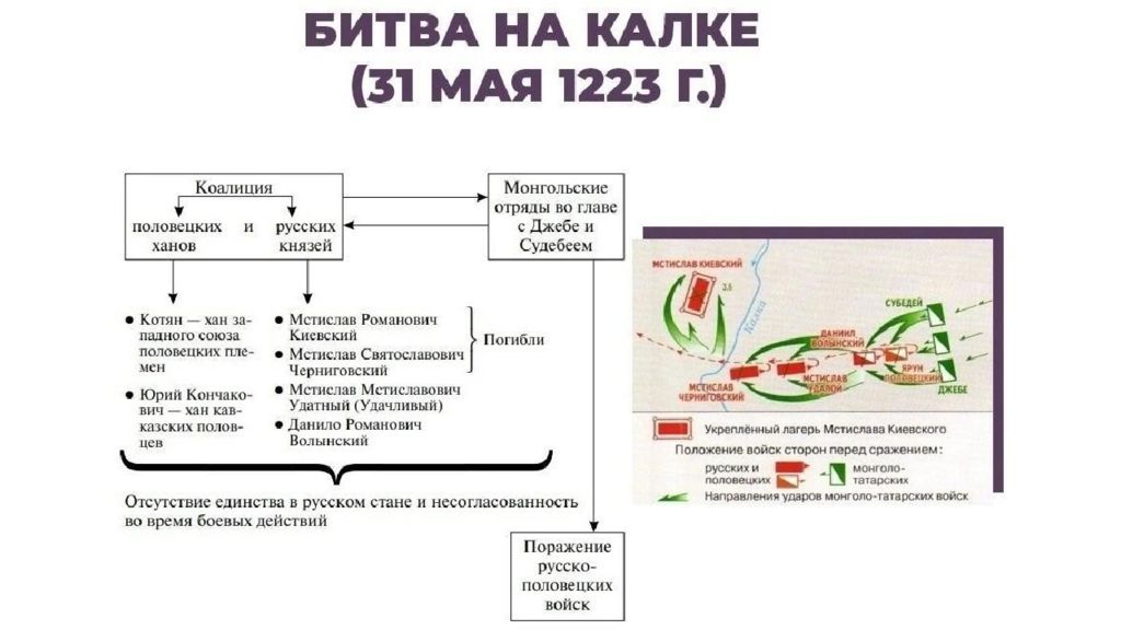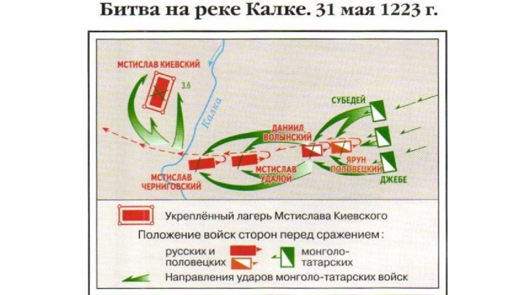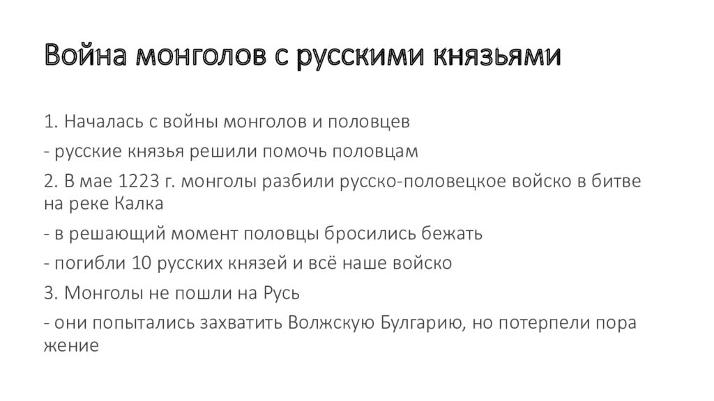 1. Началась с войны монголов и половцев - русские князья решили помочь половцам 2. В мае 1223 г. монголы разбили русско - половецкое войско в битве на реке Калка - в решающий момент половцы бросились бежать - погибли 10 русских князей и всё наше войско 3. Монголы не пошли на Русь - они попытались захватить Волжскую Булгарию, но потерпели поражение