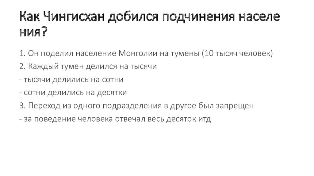 Слайд 8: Как Чингисхан добился подчинения населения ?