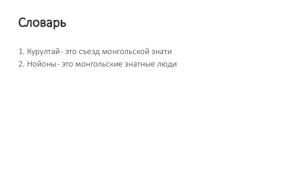 1. Курултай - это съезд монгольской знати 2. Нойоны - это монгольские знатные люди