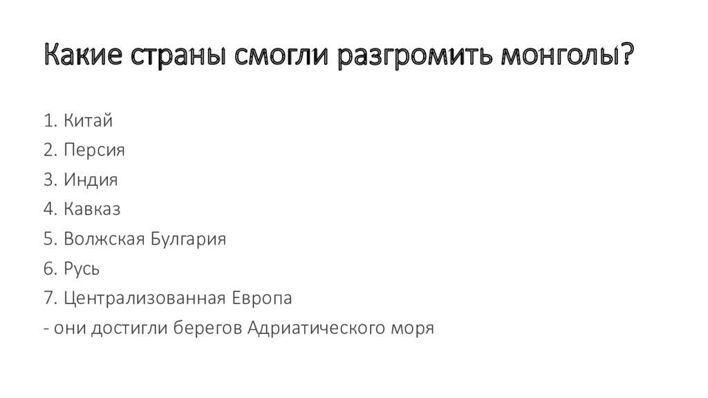 Слайд 34: Какие страны смогли разгромить монголы ?
