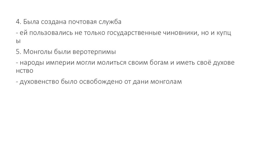 4. Была создана почтовая служба - ей пользовались не только государственные чиновники, но и купцы 5. Монголы были веротерпимы - народы империи могли молиться своим богам и иметь своё духовенство - духовенство было освобождено от дани монголам
