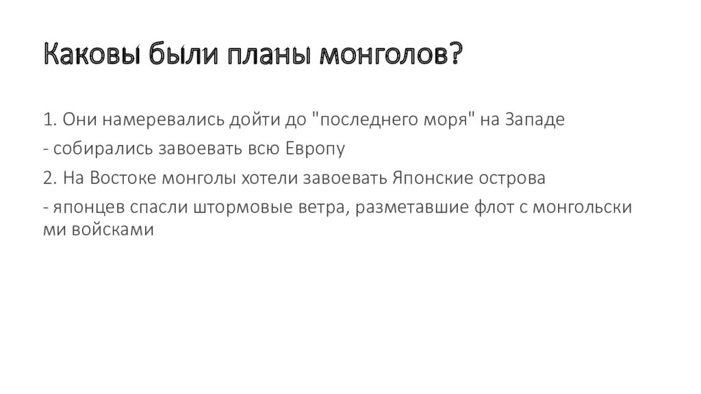 1. Они намеревались дойти до " последнего моря " на Западе - собирались завоевать всю Европу 2. На Востоке монголы хотели завоевать Японские острова - японцев спасли штормовые ветра, разметавшие флот с монгольскими войсками