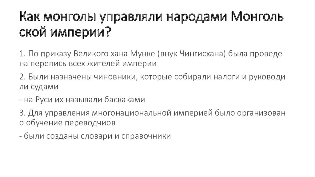 1. По приказу Великого хана Мунке ( внук Чингисхана ) была проведена перепись все х жителей империи 2. Были назначены чиновники, которые собирали налоги и руководили судами - на Руси их называли баскаками 3. Для управления многонациональной империей было организовано обучение переводчиов - были созданы словари и справочники