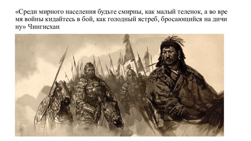 Слайд 31: Среди мирного населения будьте смирны, как малый теленок, а во время войны кидайтесь в бой, как голодный ястреб, бросающийся на дичину » Чингисхан
