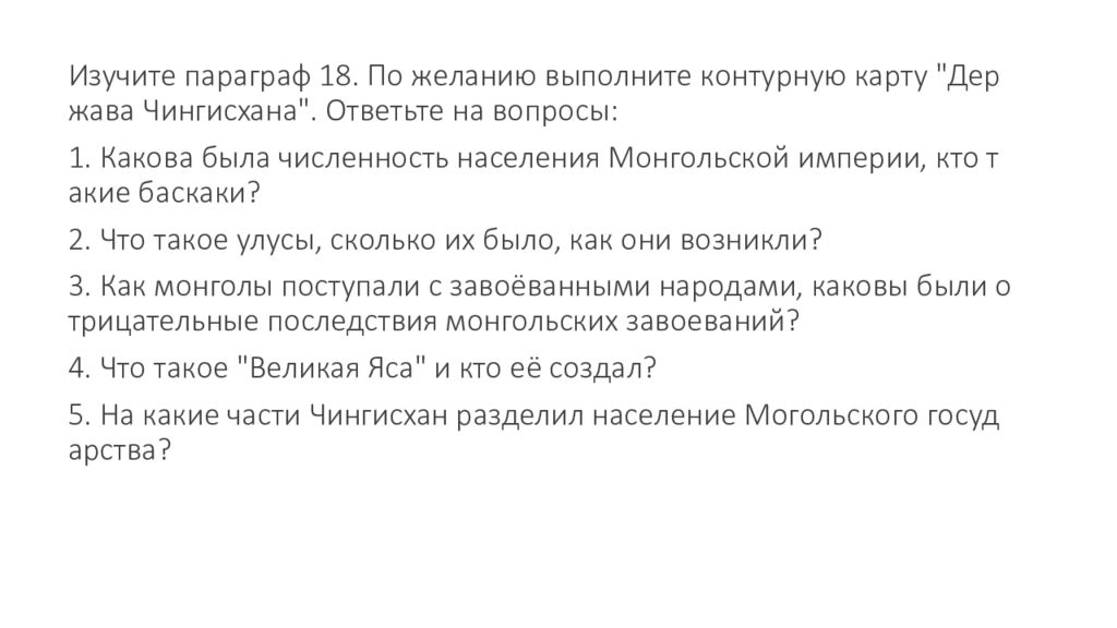 Изучите параграф 18. По желанию выполните контурную карту " Держава Чингисхана ". Ответьте на вопросы : 1. Какова была численность населения Монгольской империи, кто такие баскаки ? 2. Что такое улусы, сколько их было, как они возникли ? 3. Как монголы поступали с завоёванными народами, каковы были отрицательные последствия монгольских завоеваний ? 4. Что такое " Великая Яса " и кто её создал ? 5. На какие части Чингисхан разд ели л население Могольского государства ?