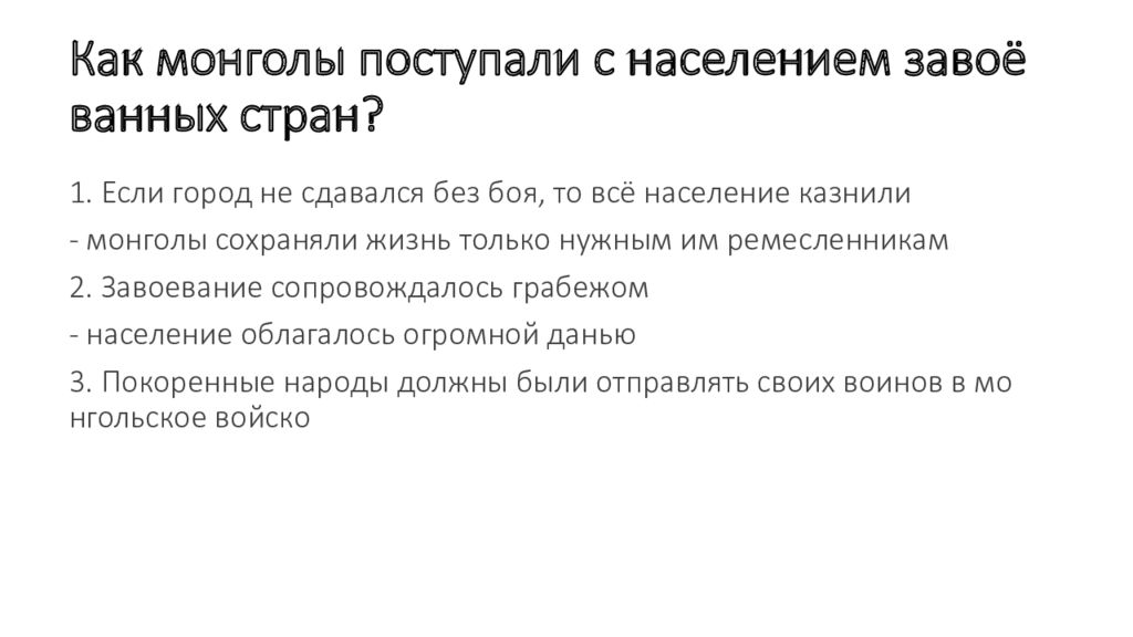 1. Если город не сдавался без боя, то всё население казнили - монголы сохраняли жизнь только нужным им ремесленникам 2. Завоевание сопровождалось грабежом - население облагалось огромной данью 3. Покоренные народы должны были отправлять своих воинов в монгольское войско