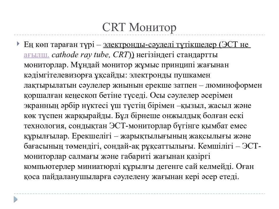 Ең көп тараған түрі – электронды-сәулелі түтікшелер (ЭСТ не ағылш. cathode ray tube, CRT ) ) негізіндегі стандартты мониторлар. Мұндай монитор жұмыс принципі жағынан кәдімгітелевизорға ұқсайды: электронды пушкамен лақтырылатын сәулелер жиынын ерекше затпен – люминоформен қоршалған кеңескоп бетіне түседі. Осы сәулелер әсерімен экранның әрбір нүктесі үш түстің бірімен –қызыл, жасыл және көк түспен жарқырайды. Бұл бірнеше онжылдық болған ескі технология, сондықтан ЭСТ-мониторлар бүгінге қымбат емес құрылғылар. Ерекшелігі – жарықтылығының жақсылығы және бағасының төмендігі, сондай-ақ рұқсаттылығы. Кемшілігі – ЭСТ-мониторлар салмағы және габариті жағынан қазіргі компьютерлер миниатюрлі құрылғы дегенге сай келмейді. Оған қоса пайдаланушыларға сәулелену жағынан кері әсер етеді.