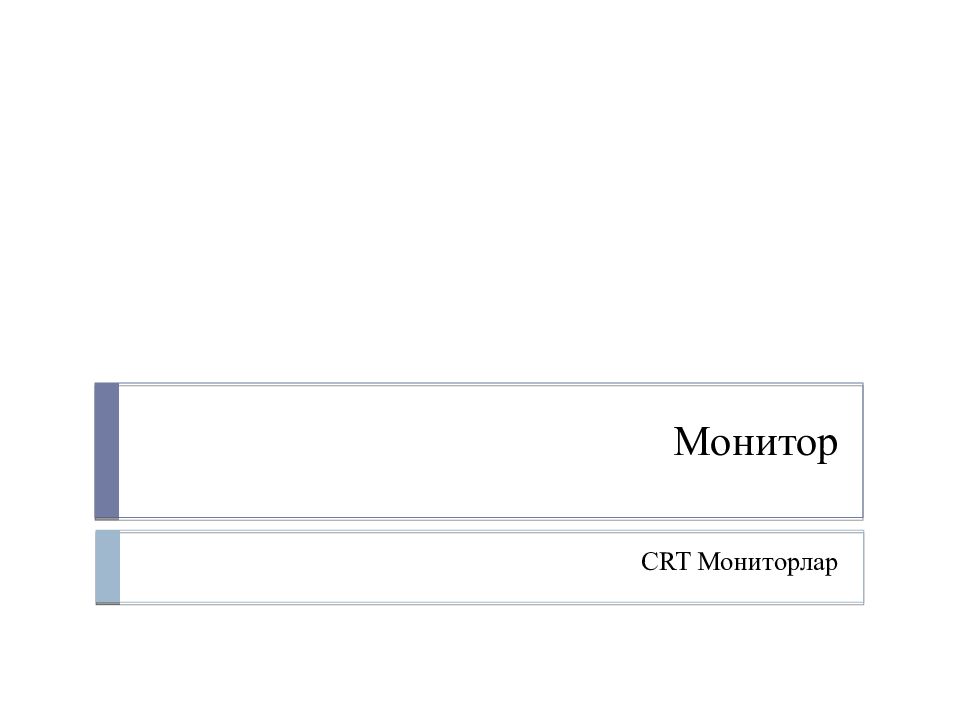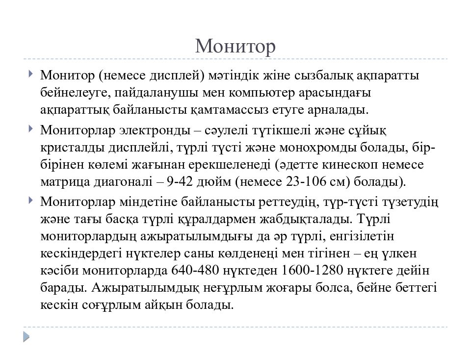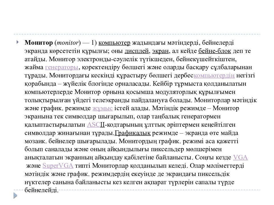 Монитор ( mon і tor ) — 1) компьютер жадындағы мәтіндерді, бейнелерді экранда көрсететін құрылғы ; оны дисплей, экран, ал кейде бейне-блок деп те атайды. Монитор электронды-сәулелік түтікшеден, бейнекүшейткіштен, жайма генераторы, қоректендіру бөлшегі және оларды басқару сұлбаларынан тұрады. Монитордағы кескінді құрастыру бөлшегі дербес компьютердің негізгі қорабында – жүйелік блогінде орналасады. Кейбір тұрмыста қолданылатын компьютерлерде Монитор орнына қосымша модуляторлық құрылғымен толықтырылған үйдегі телеэкранды пайдалануға болады. Мониторлар мәтіндік және график. режимде жұмыс істей алады. Мәтіндік режимде – Монитор экранына тек символдар шығарылып, олар таңбалық генератормен қалыптастырылатын ASC ІІ -кодтарының ұлттық әріптермен кеңейтілген символдар жинағынан тұрады. Графикалық режимде – экранда өте майда мозаик. бейнелер шығарылады. Монитордың график. режимі аса қажетті болып саналады және оның айқындылығы пиксельдер мөлшерімен анықталатын экранның айқындау қабілетіне байланысты. Соңғы кезде VGA және SuperVGA типті Мониторлар қолданылып келеді. Олар мәліметтерді мәтіндік және график. режимдердің екеуінде де экрандағы пиксельдік нүктелер санына байланысты кез келген ақпарат түрлерін сапалы түрде бейнелейді.