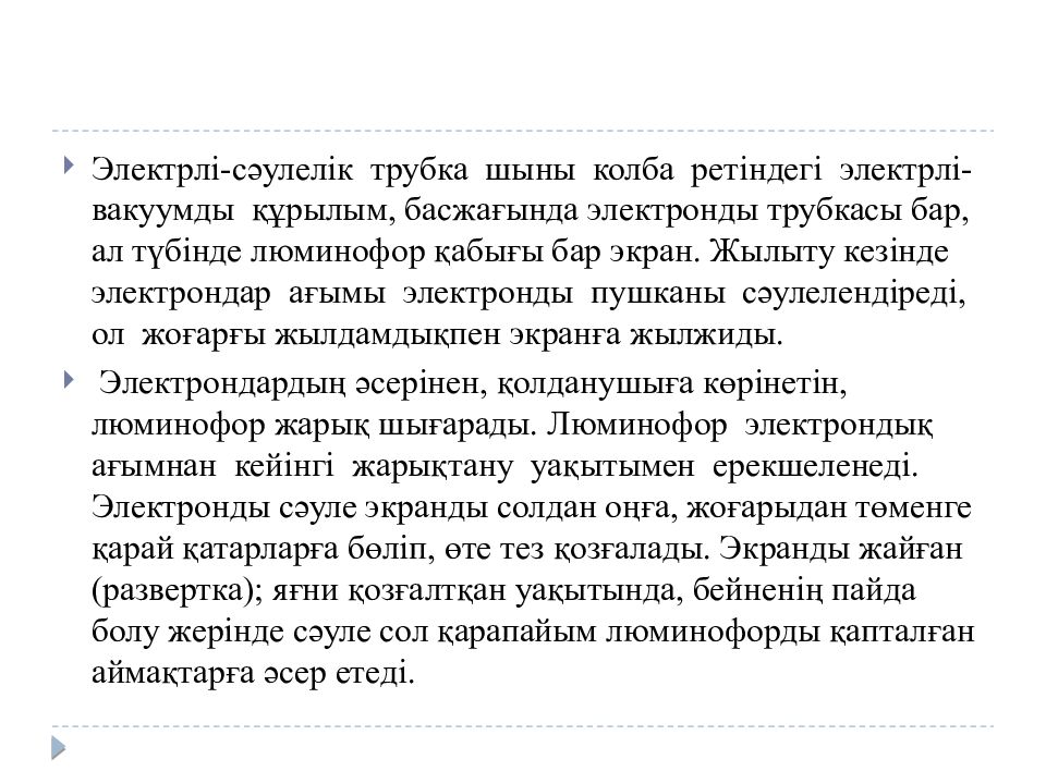 Электрлі-сәулелік трубка шыны колба ретіндегі электрлі-вакуумды құрылым, басжағында электронды трубкасы бар, ал түбінде люминофор қабығы бар экран. Жылыту кезінде электрондар ағымы электронды пушканы сәулелендіреді, ол жоғарғы жылдамдықпен экранға жылжиды. Электрондардың әсерінен, қолданушыға көрінетін, люминофор жарық шығарады. Люминофор электрондық ағымнан кейінгі жарықтану уақытымен ерекшеленеді. Электронды сәуле экранды солдан оңға, жоғарыдан төменге қарай қатарларға бөліп, өте тез қозғалады. Экранды жайған (развертка); яғни қозғалтқан уақытында, бейненің пайда болу жерінде сәуле сол қарапайым люминофорды қапталған аймақтарға әсер етеді.