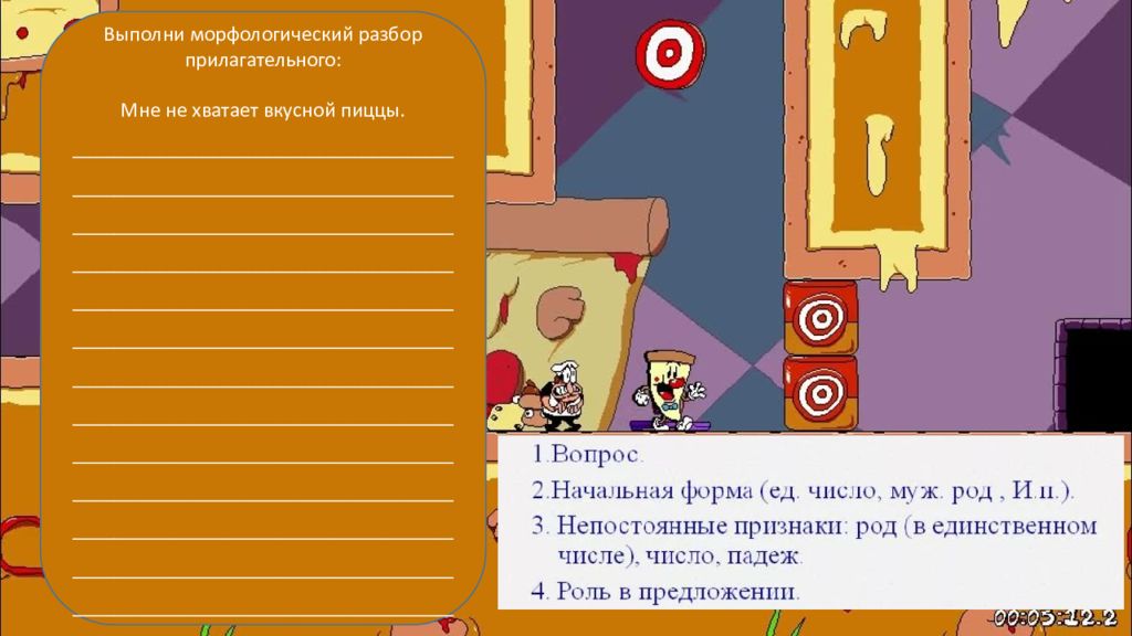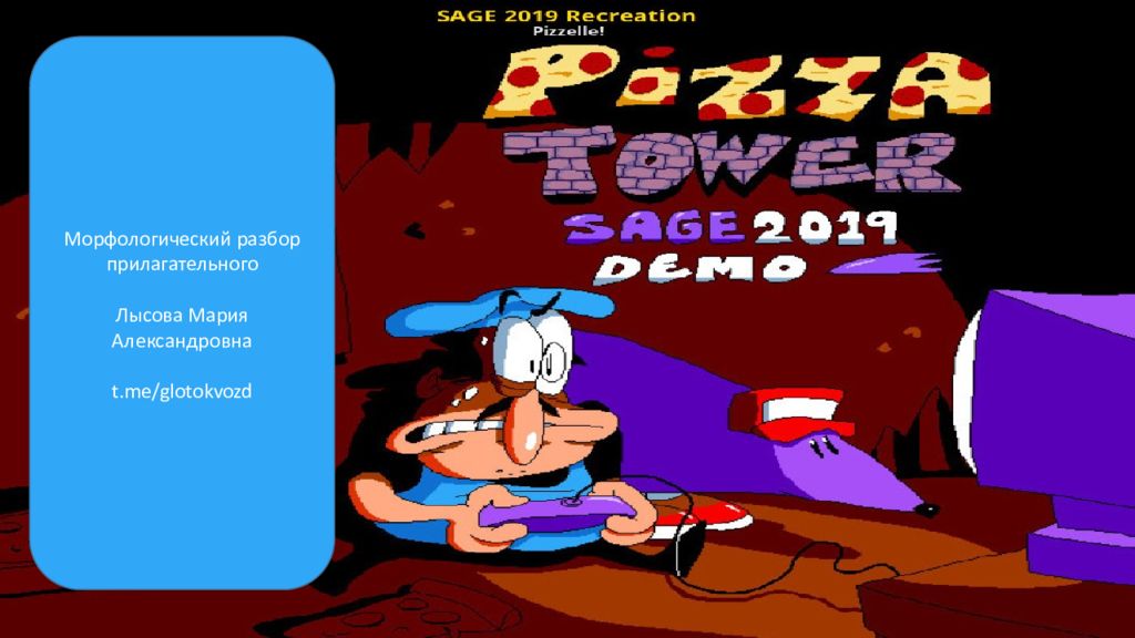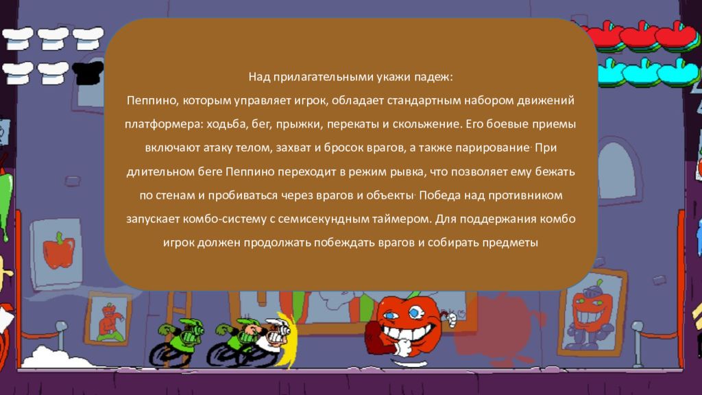 Подчеркни прилагательные, чаще всего они являются определениями Маленький п иццайло Пеппино Спагетти вынужден подняться на вершину башни, чтобы спасти свою уютную пиццерию от уничтожения. Увлекательная игра состоит из 20 сложных уровней с боковой прокруткой. Каждый уровень завершается скорым побегом, в котором игрок должен быстро вернуться к начальной точке за ограниченное время. Pizza Tower приобрела большое количество поклонников еще на первичной стадии разработки. Игра получила положительные отзывы критиков и была номинирована на несколько наград по итогам года.
