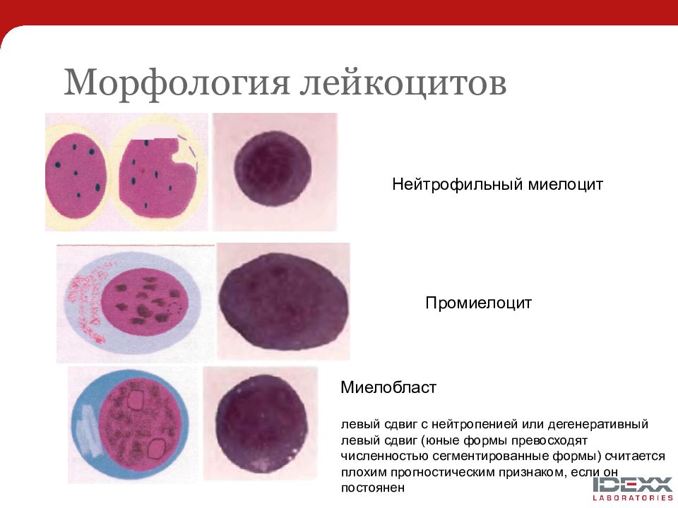 Нейтрофильный миелоцит Промиелоцит Миелобласт левый сдвиг с нейтропенией или дегенеративный левый сдвиг (юные формы превосходят численностью сегментированные формы) считается плохим прогностическим признаком, если он постоянен