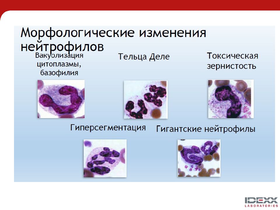 Тельца Деле представляют собой самую слабую (наиболее мягкую) форму среди всех токсических изменений цитоплазмы, появляются в первую очередь и служат первым признаком нарушений гранулопоэза. Базофилия цитоплазмы – проявление повышенного количества рибосомальной РНК. признак более тяжелых нарушений в созревании нейтрофила. Токсическая грануляция – исключительно редкое явление при очень тяжелых эндотоксемиях, которое проявляется в виде грануляции и, в основном, встречается у кошек и лошадей