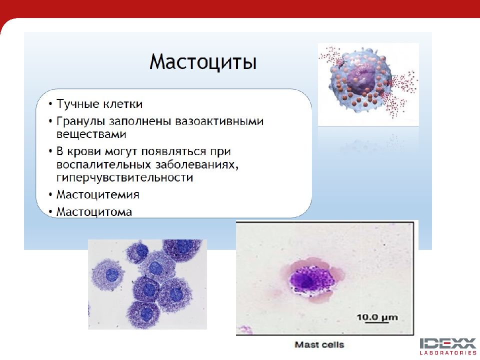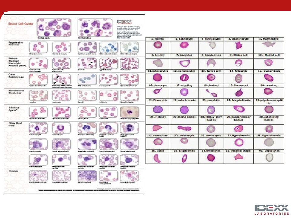 Реактивные лимфоциты Большие гранулярные лимфоциты Атипичные лимфоциты и лимфобласты Увеличенное число связанно с эрлихиозом и хронической лимфоцитарной лейкемией. лимфома или острый лимфоцитарный лейкоз; могут быть в малом количестве при некоторых воспалительных заболевани