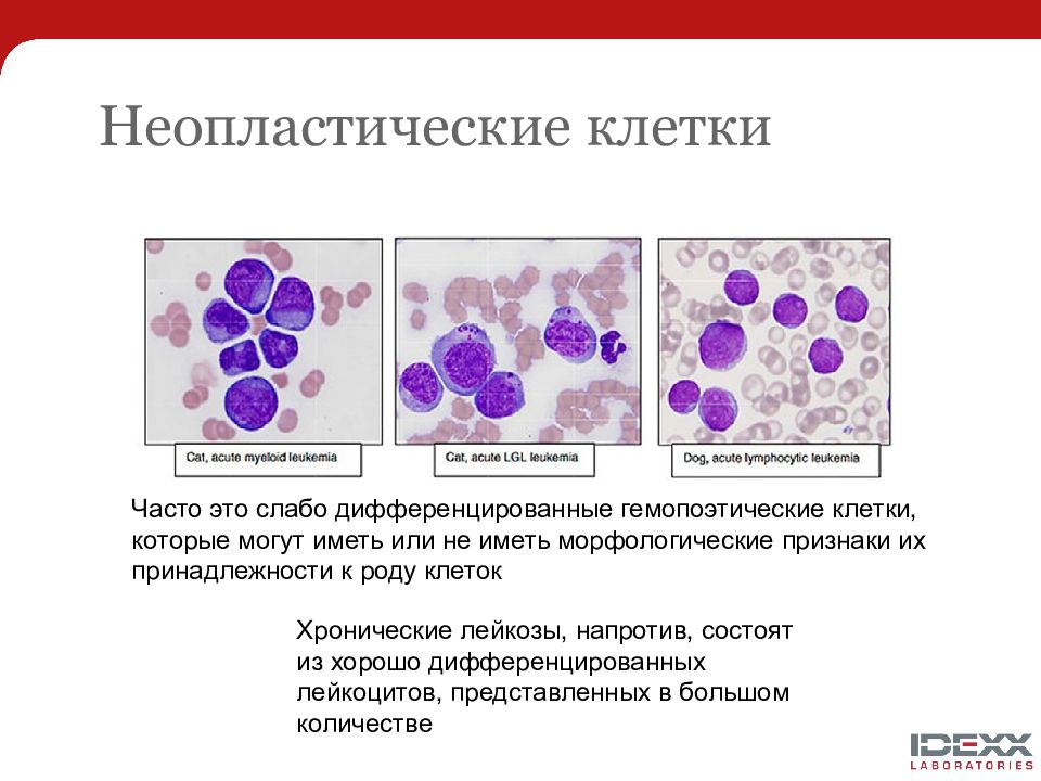 Часто это слабо дифференцированные гемопоэтические клетки, которые могут иметь или не иметь морфологические признаки их принадлежности к роду клеток Хронические лейкозы, напротив, состоят из хорошо дифференцированных лейкоцитов, представленных в большом количестве