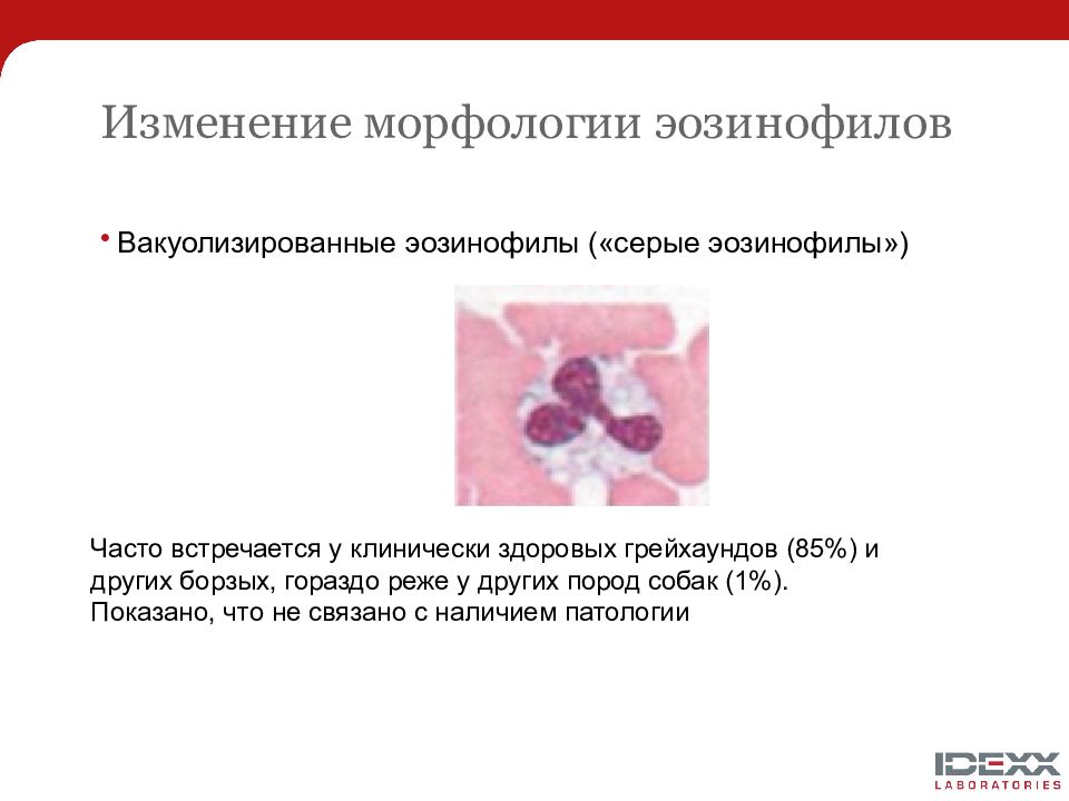 Вакуолизированные эозинофилы («серые эозинофилы») Часто встречается у клинически здоровых грейхаундов (85%) и других борзых, гораздо реже у других пород собак (1%). Показано, что не связано с наличием патологии