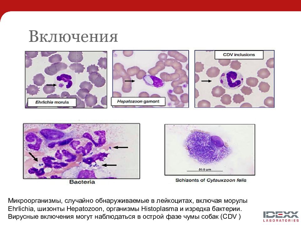 Микроорганизмы, случайно обнаруживаемые в лейкоцитах, включая морулы Ehrlichia, шизонты Hepatozoon, организмы Histoplasma и изредка бактерии. Вирусные включения могут наблюдаться в острой фазе чумы собак (CDV )