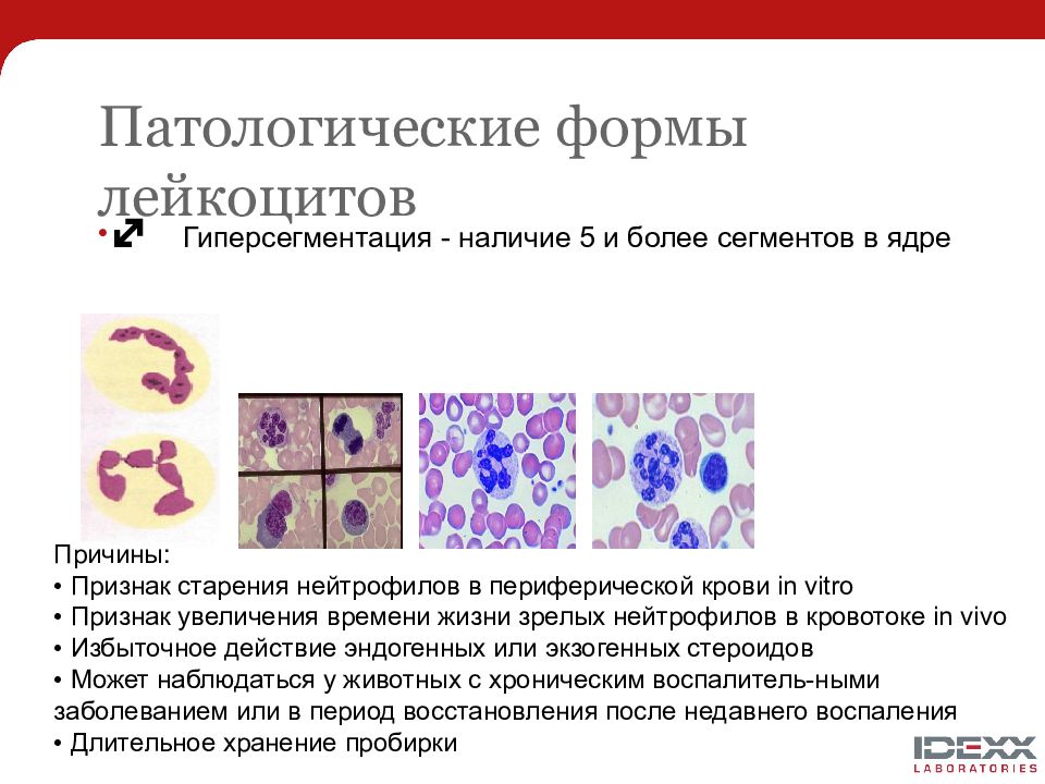 Гиперсегментация - наличие 5 и более сегментов в ядре Причины: • Признак старения нейтрофилов в периферической крови in vitro • Признак увеличения времени жизни зрелых нейтрофилов в кровотоке in vivo • Избыточное действие эндогенных или экзогенных стероидов • Может наблюдаться у животных с хроническим воспалитель-ными заболеванием или в период восстановления после недавнего воспаления • Длительное хранение пробирки