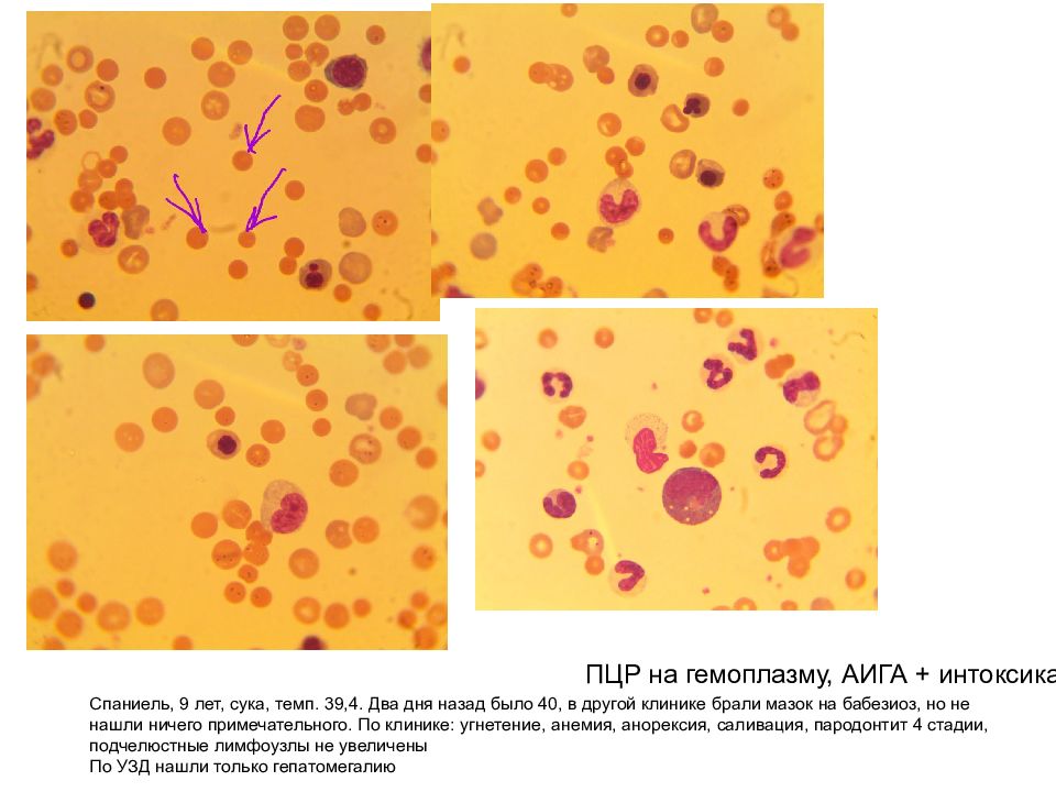 ПЦР на гемоплазму, АИГА + интоксикация Спаниель, 9 лет, сука, темп. 39,4. Два дня назад было 40, в другой клинике брали мазок на бабезиоз, но не нашли ничего примечательного. По клинике: угнетение, анемия, анорексия, саливация, пародонтит 4 стадии, подчелюстные лимфоузлы не увеличены По УЗД нашли только гепатомегалию