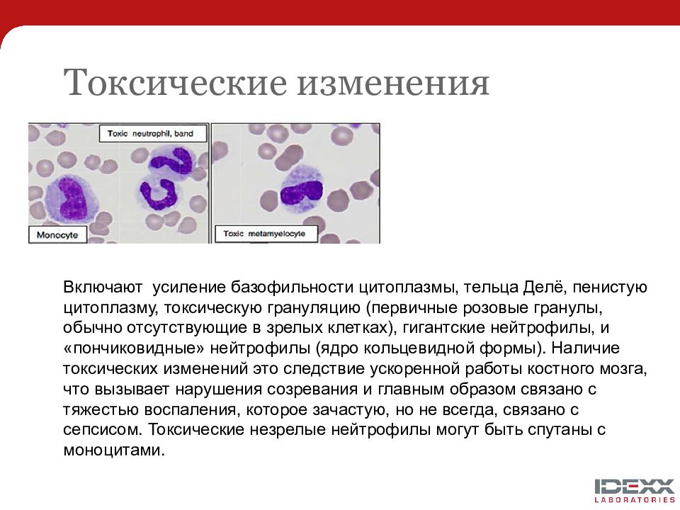 Включают усиление базофильности цитоплазмы, тельца Делё, пенистую цитоплазму, токсическую грануляцию (первичные розовые гранулы, обычно отсутствующие в зрелых клетках), гигантские нейтрофилы, и «пончиковидные» нейтрофилы (ядро кольцевидной формы). Наличие токсических изменений это следствие ускоренной работы костного мозга, что вызывает нарушения созревания и главным образом связано с тяжестью воспаления, которое зачастую, но не всегда, связано с сепсисом. Токсические незрелые нейтрофилы могут быть спутаны с моноцитами.