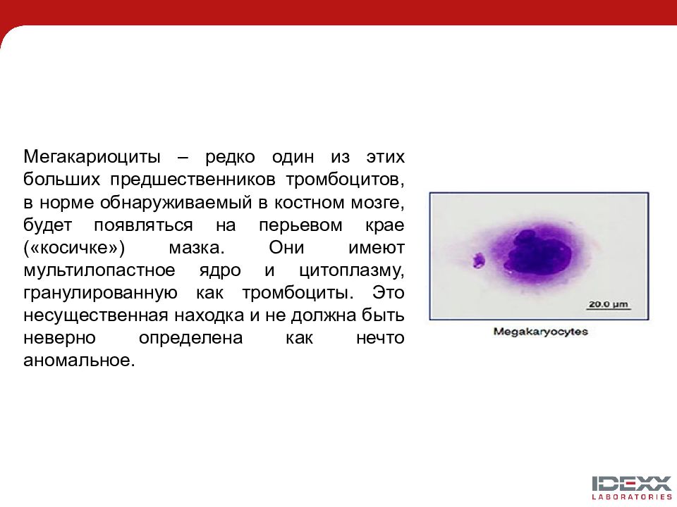 Мегакариоциты – редко один из этих больших предшественников тромбоцитов, в норме обнаруживаемый в костном мозге, будет появляться на перьевом крае («косичке») мазка. Они имеют мультилопастное ядро и цитоплазму, гранулированную как тромбоциты. Это несущественная находка и не должна быть неверно определена как нечто аномальное.