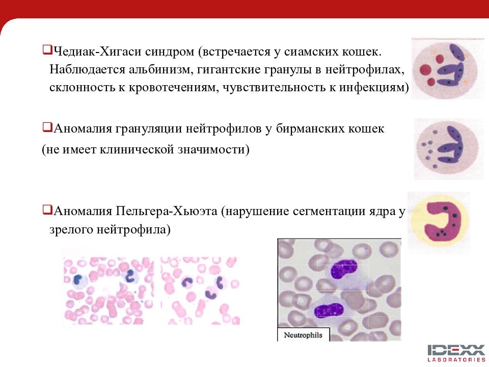 Чедиак-Хигаси синдром (встречается у сиамских кошек. Наблюдается альбинизм, гигантские гранулы в нейтрофилах, склонность к кровотечениям, чувствительность к инфекциям) Аномалия грануляции нейтрофилов у бирманских кошек (не имеет клинической значимости) Аномалия Пельгера-Хьюэта (нарушение сегментации ядра у зрелого нейтрофила)