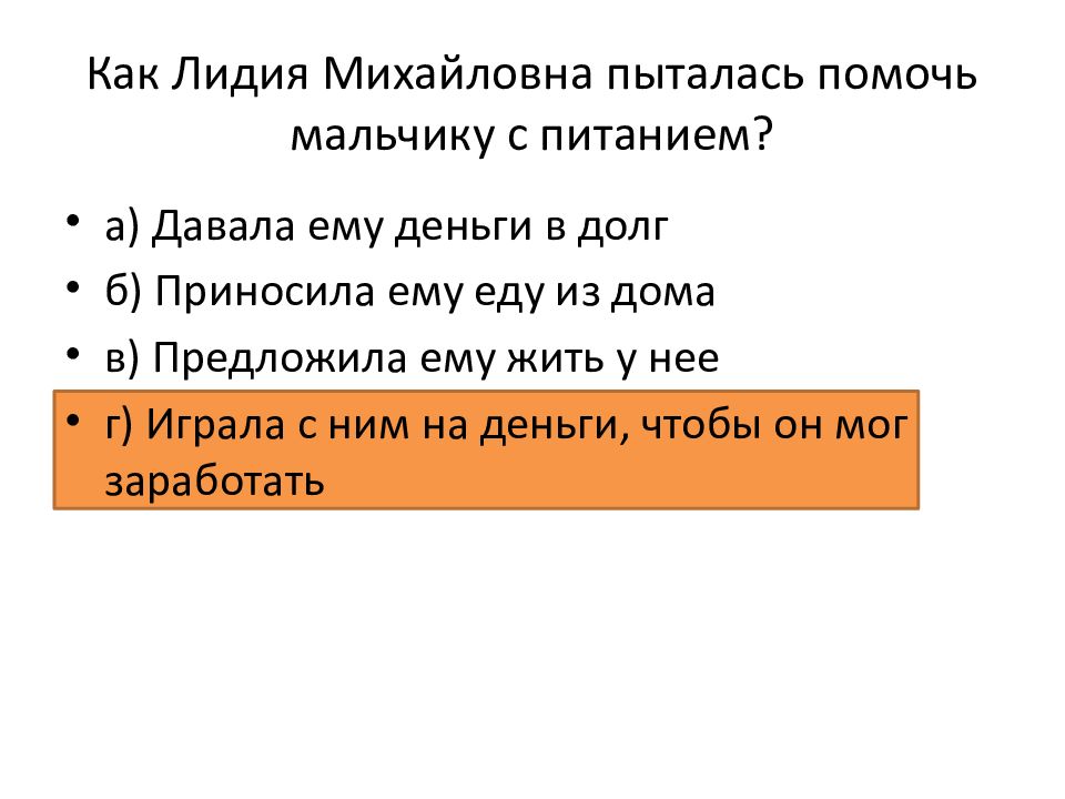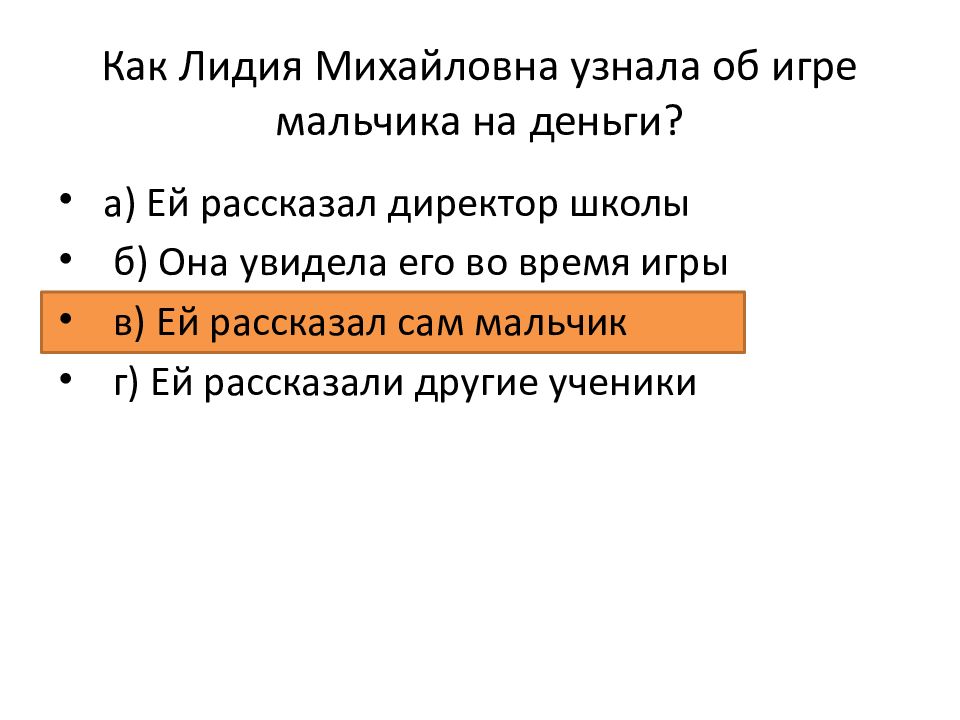 Слайд 25: Как Лидия Михайловна узнала об игре мальчика на деньги?