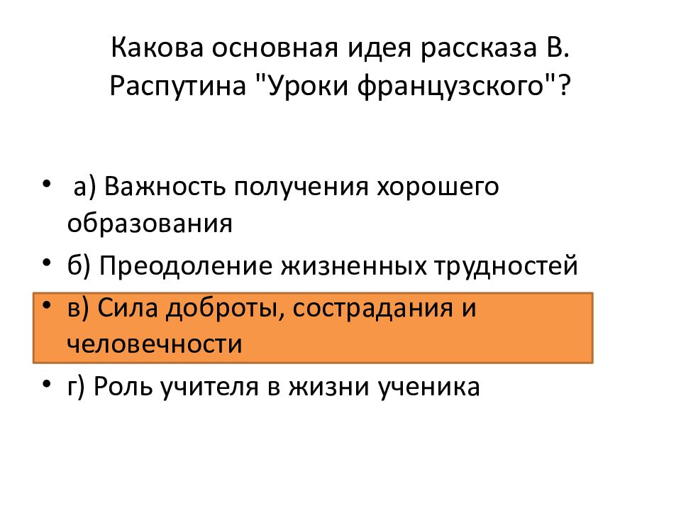 Слайд 13: Какова основная идея рассказа В. Распутина "Уроки французского"?