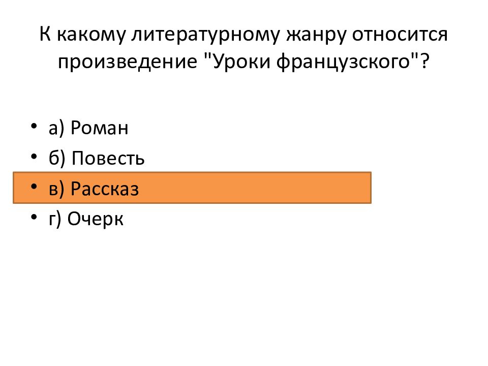Слайд 24: К какому литературному жанру относится произведение "Уроки французского"?