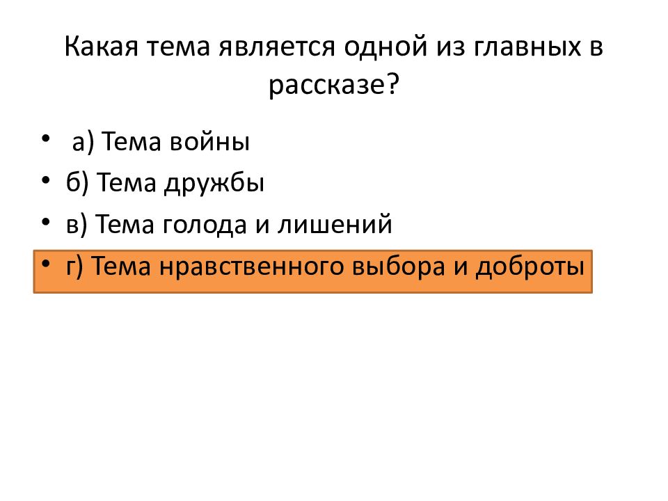 а) Тема войны б) Тема дружбы в) Тема голода и лишений г) Тема нравственного выбора и доброты