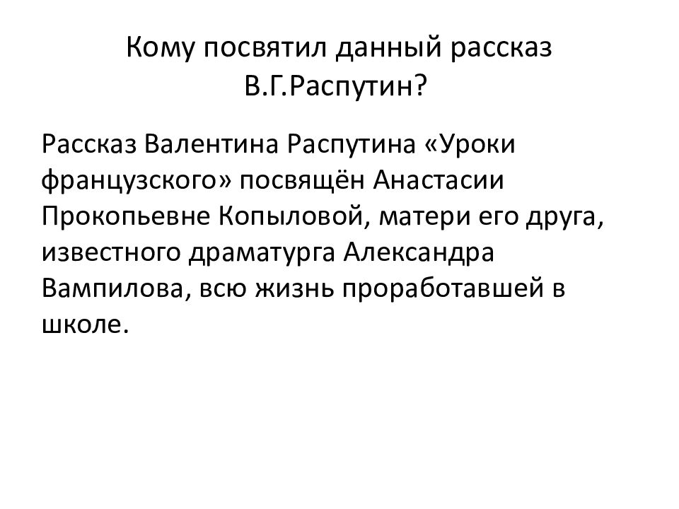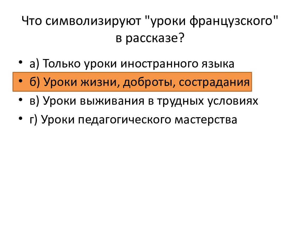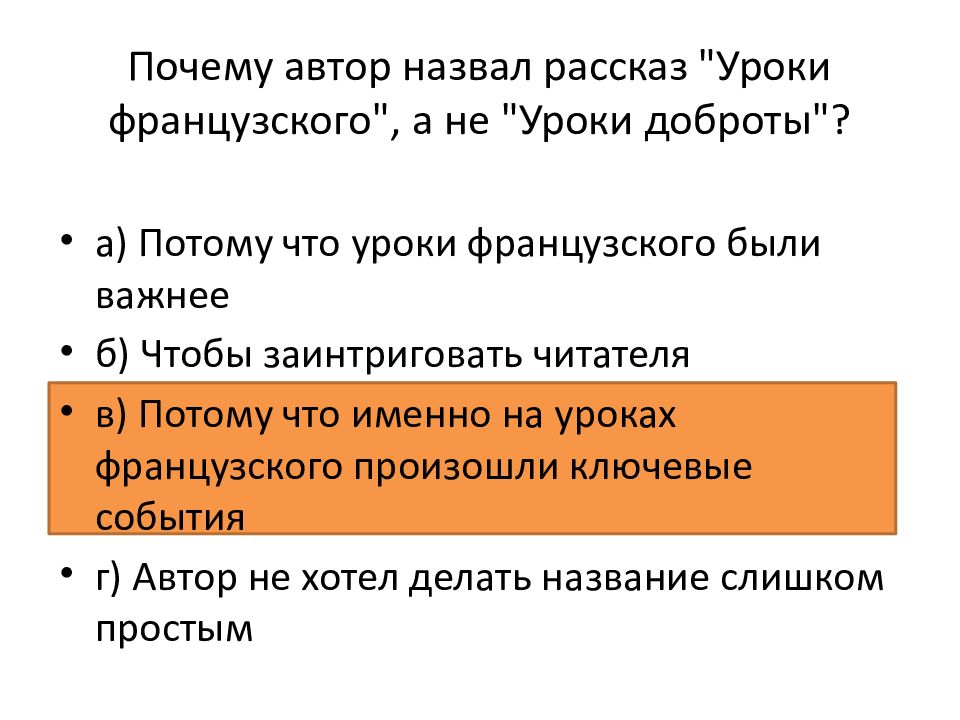 Слайд 33: Почему автор назвал рассказ "Уроки французского", а не "Уроки доброты"?