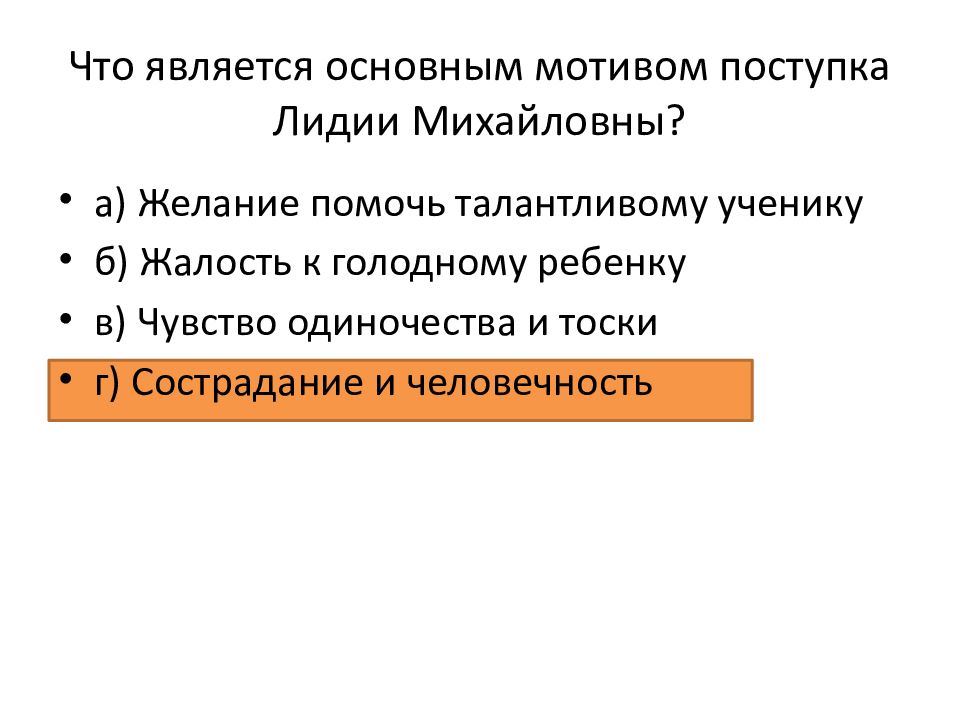 Слайд 31: Что является основным мотивом поступка Лидии Михайловны?