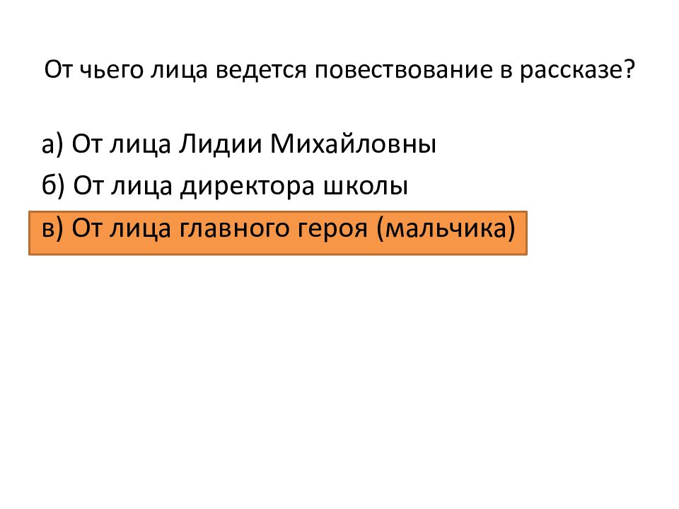 а) От лица Лидии Михайловны б) От лица директора школы в) От лица главного героя (мальчика)