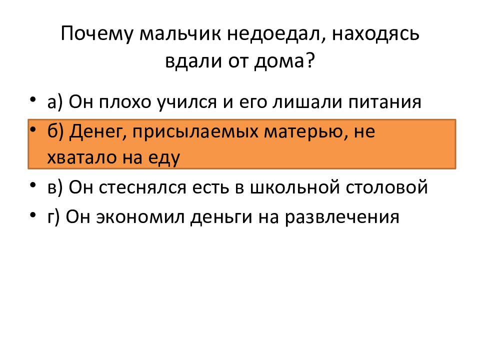 Слайд 14: Почему мальчик недоедал, находясь вдали от дома?