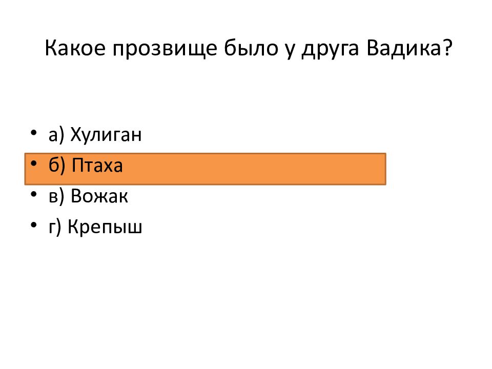 а) Хулиган б) Птаха в) Вожак г) Крепыш