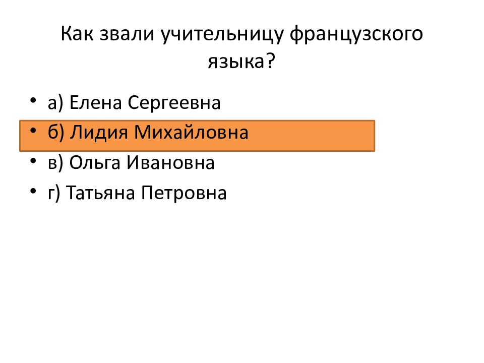 a) Елена Сергеевна б) Лидия Михайловна в) Ольга Ивановна г) Татьяна Петровна