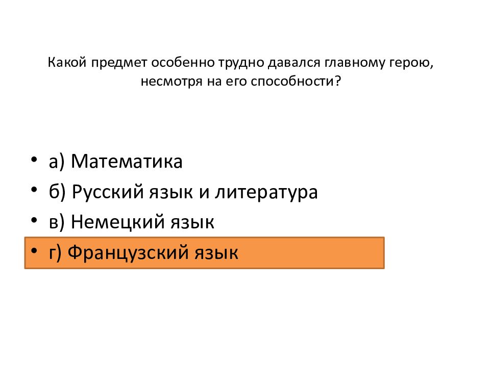 Слайд 12: Какой предмет особенно трудно давался главному герою, несмотря на его способности?