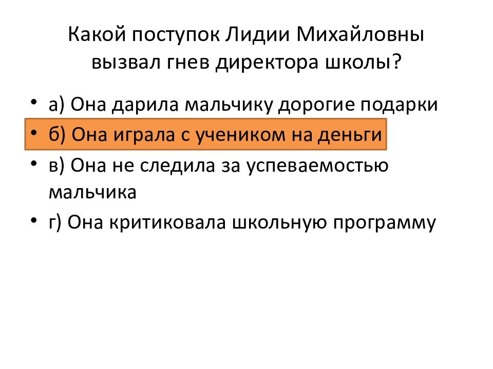 Слайд 26: Какой поступок Лидии Михайловны вызвал гнев директора школы?