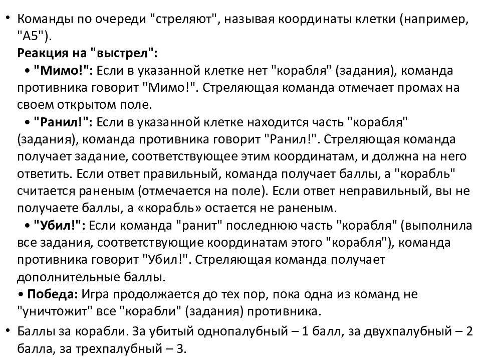 Команды по очереди "стреляют", называя координаты клетки (например, "А5"). Реакция на "выстрел": • "Мимо!": Если в указанной клетке нет "корабля" (задания), команда противника говорит "Мимо!". Стреляющая команда отмечает промах на своем открытом поле. • "Ранил!": Если в указанной клетке находится часть "корабля" (задания), команда противника говорит "Ранил!". Стреляющая команда получает задание, соответствующее этим координатам, и должна на него ответить. Если ответ правильный, команда получает баллы, а "корабль" считается раненым (отмечается на поле). Если ответ неправильный, вы не получаете баллы, а «корабль» остается не раненым. • "Убил!": Если команда "ранит" последнюю часть "корабля" (выполнила все задания, соответствующие координатам этого "корабля"), команда противника говорит "Убил!". Стреляющая команда получает дополнительные баллы. • Победа: Игра продолжается до тех пор, пока одна из команд не "уничтожит" все "корабли" (задания) противника. Баллы за корабли. За убитый однопалубный – 1 балл, за двухпалубный – 2 балла, за трехпалубный – 3.
