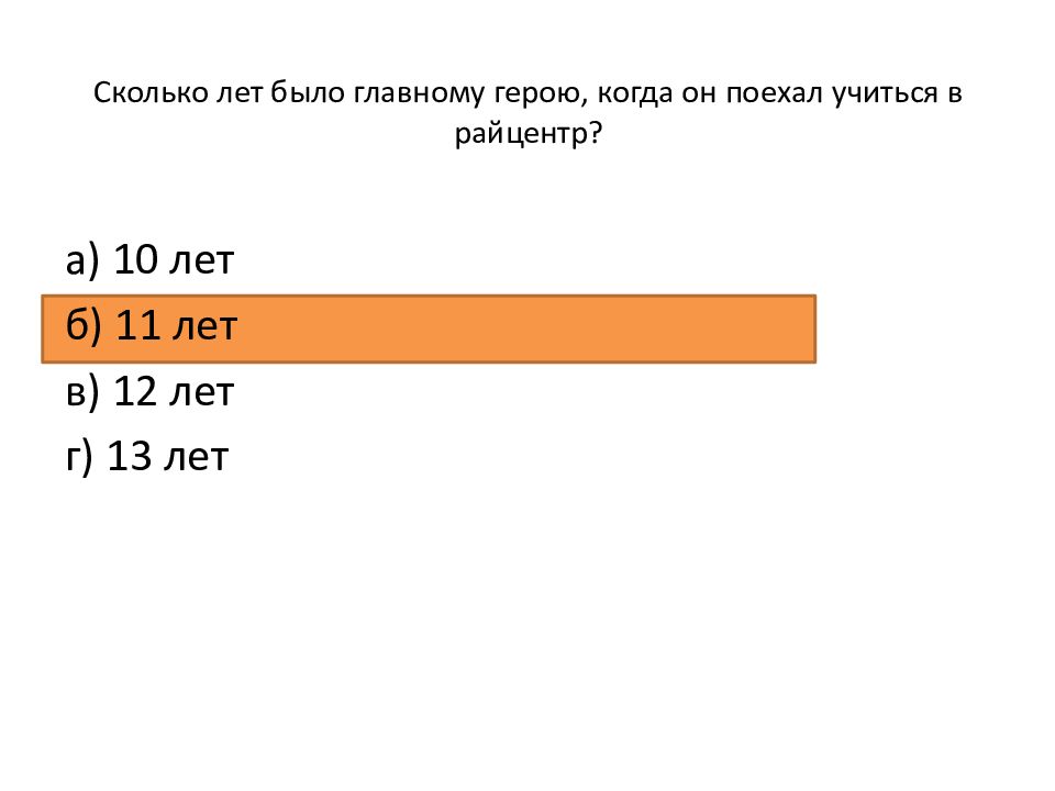 Слайд 7: Сколько лет было главному герою, когда он поехал учиться в райцентр?