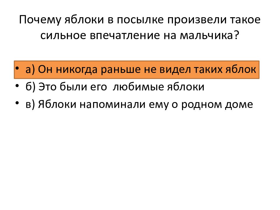 Слайд 29: Почему яблоки в посылке произвели такое сильное впечатление на мальчика?