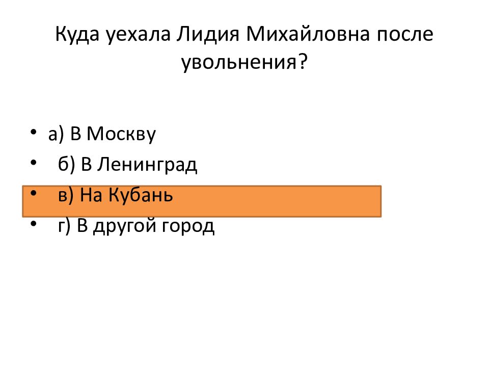 Слайд 30: Куда уехала Лидия Михайловна после увольнения?