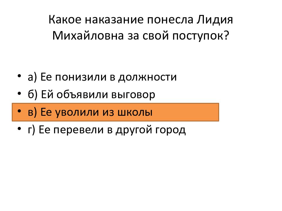 Слайд 27: Какое наказание понесла Лидия Михайловна за свой поступок?