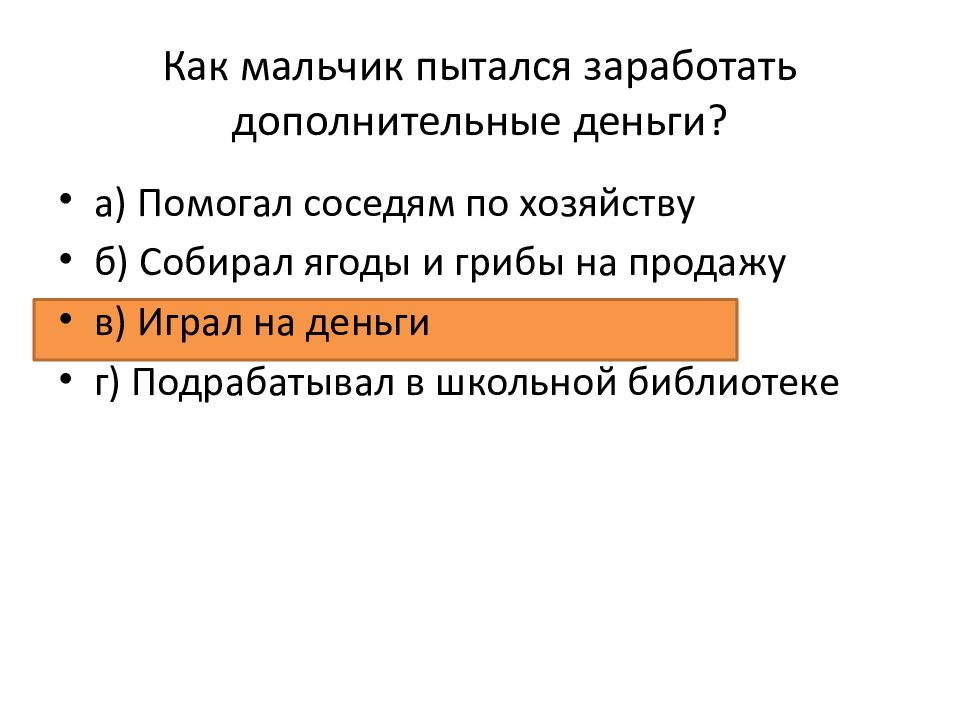 а) Помогал соседям по хозяйству б) Собирал ягоды и грибы на продажу в) Играл на деньги г) Подрабатывал в школьной библиотеке