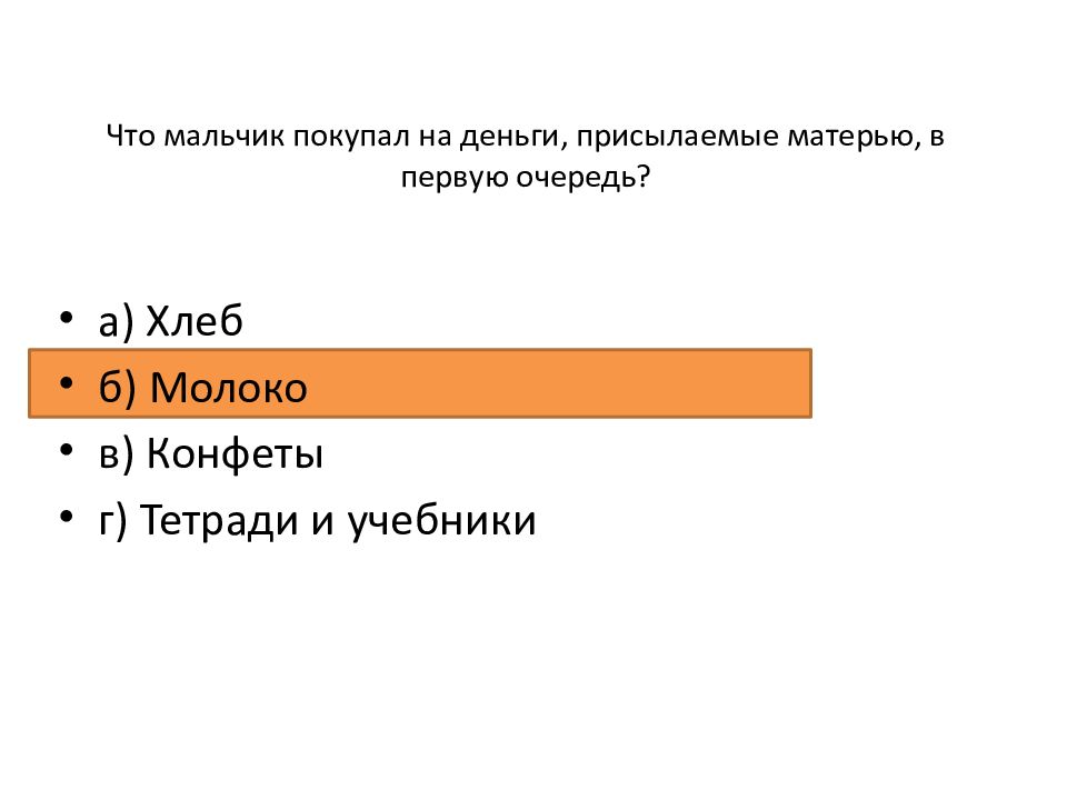 Слайд 15: Что мальчик покупал на деньги, присылаемые матерью, в первую очередь?