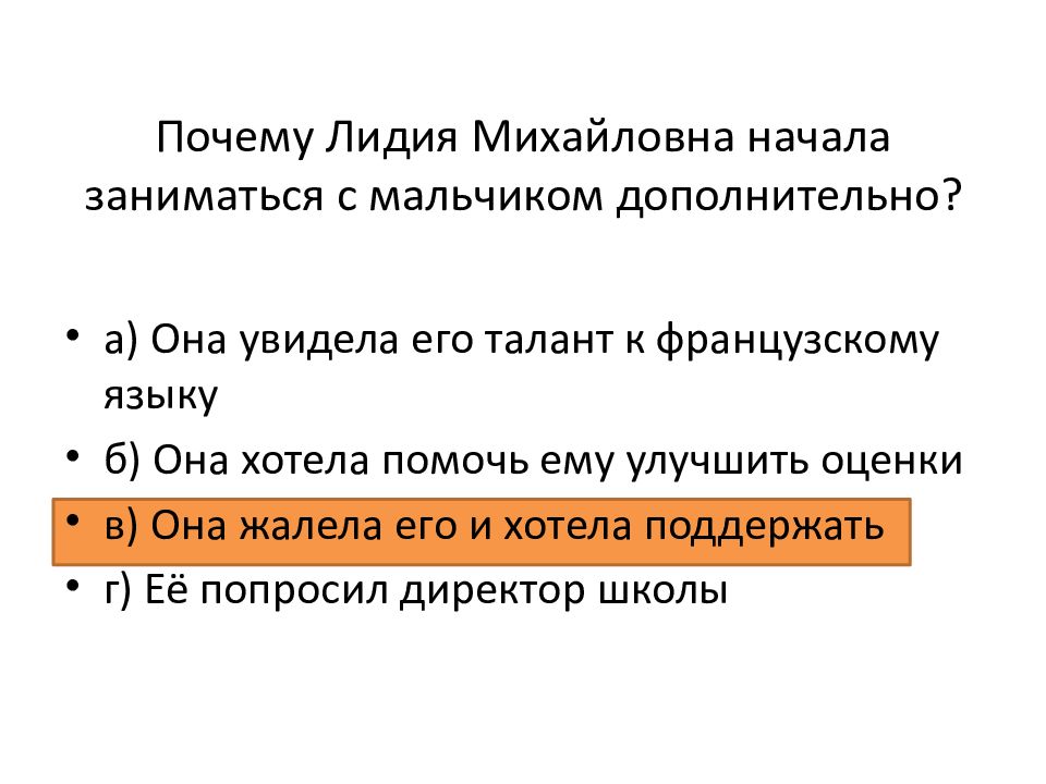 Слайд 20: Почему Лидия Михайловна начала заниматься с мальчиком дополнительно?