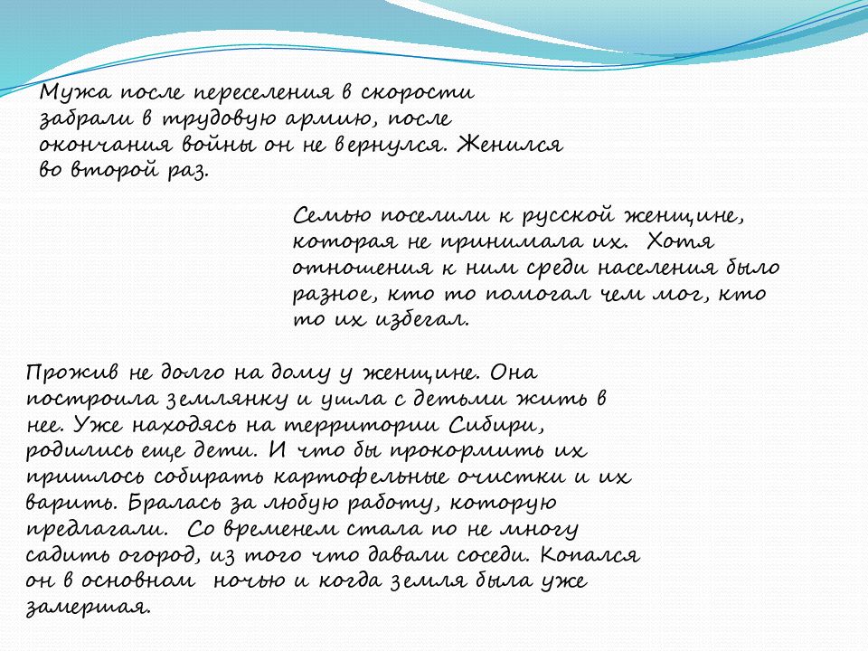 Мужа после переселения в скорости забрали в трудовую армию, после окончания войны он не вернулся. Женился во второй раз. Семью поселили к русской женщине, которая не принимала их. Хотя отношения к ним среди населения было разное, кто то помогал чем мог, кто то их избегал. Прожив не долго на дому у женщине. Она построила землянку и ушла с детьми жить в нее. Уже находясь на территории Сибири, родились еще дети. И что бы прокормить их пришлось собирать картофельные очистки и их варить. Бралась за любую работу, которую предлагали. Со временем стала по не многу садить огород, из того что давали соседи. Копался он в основном ночью и когда земля была уже замершая.